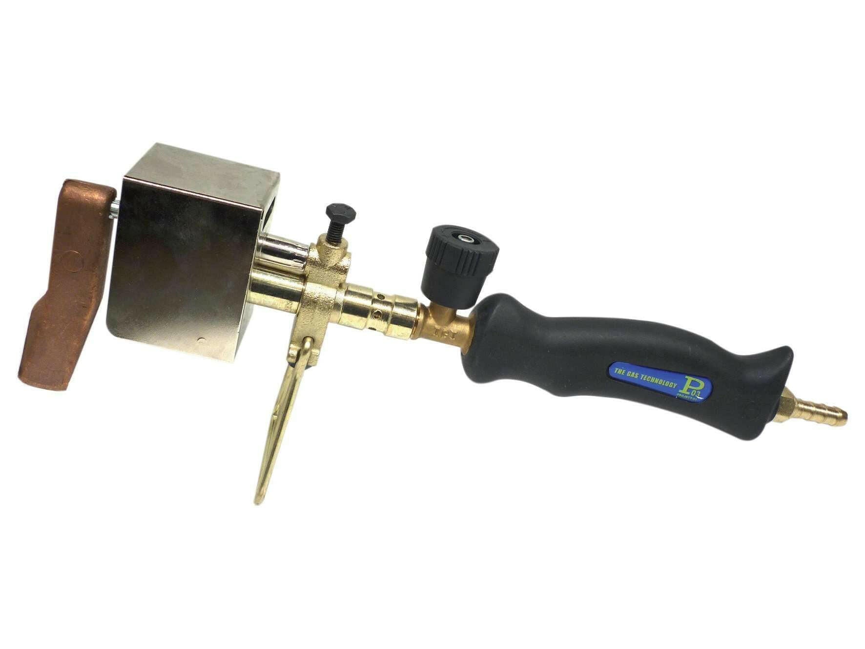 con mazza rame da 200 g e rubinetto per la regolazione della fuoriuscita del gas. Lavora in pressione diretta senza necessità di regolatore. Diametro bruciatore 15 mm